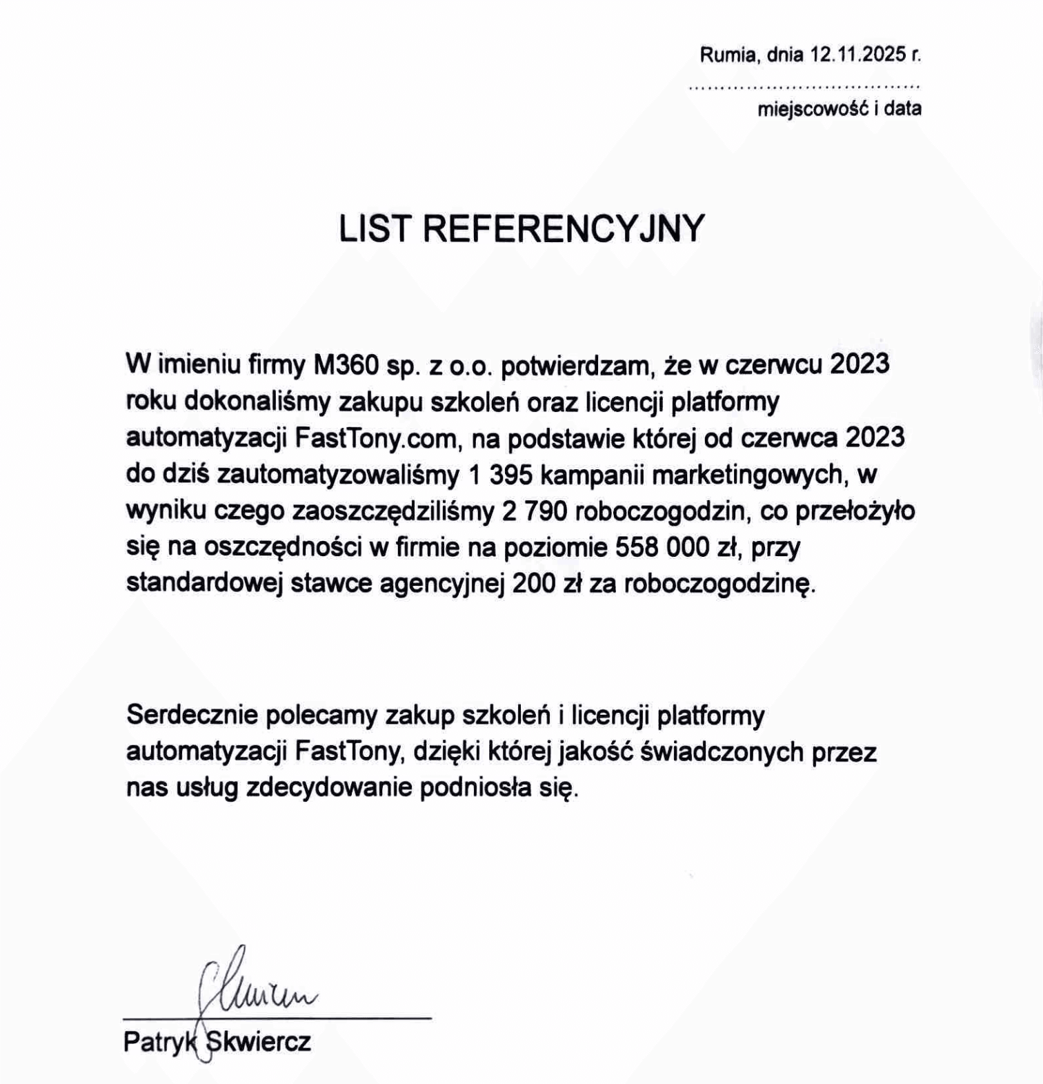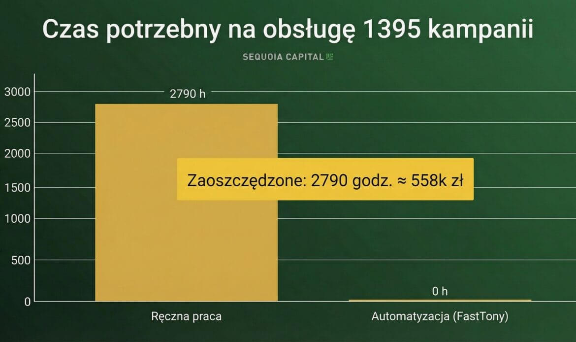 Właśnie dlatego automatyzacja marketingu przestaje być "miłym dodatkiem", a staje się sposobem pracy. Coraz częściej rolę operacyjnego "silnika" przejmują platformy oparte o sztuczną inteligencję - takie jak FastTony.com. I nie są to puste deklaracje. W liście referencyjnym Patryk Skwiercz z agencji M360 wskazuje, że od czerwca 2023 r. do momentu wystawienia rekomendacji zautomatyzowali łącznie 1395 kampanii marketingowych, oszczędzając 2790 roboczogodzin. Przy założeniu 200 zł za godzinę daje to ok. 558 000 zł wartości czasu pracy.