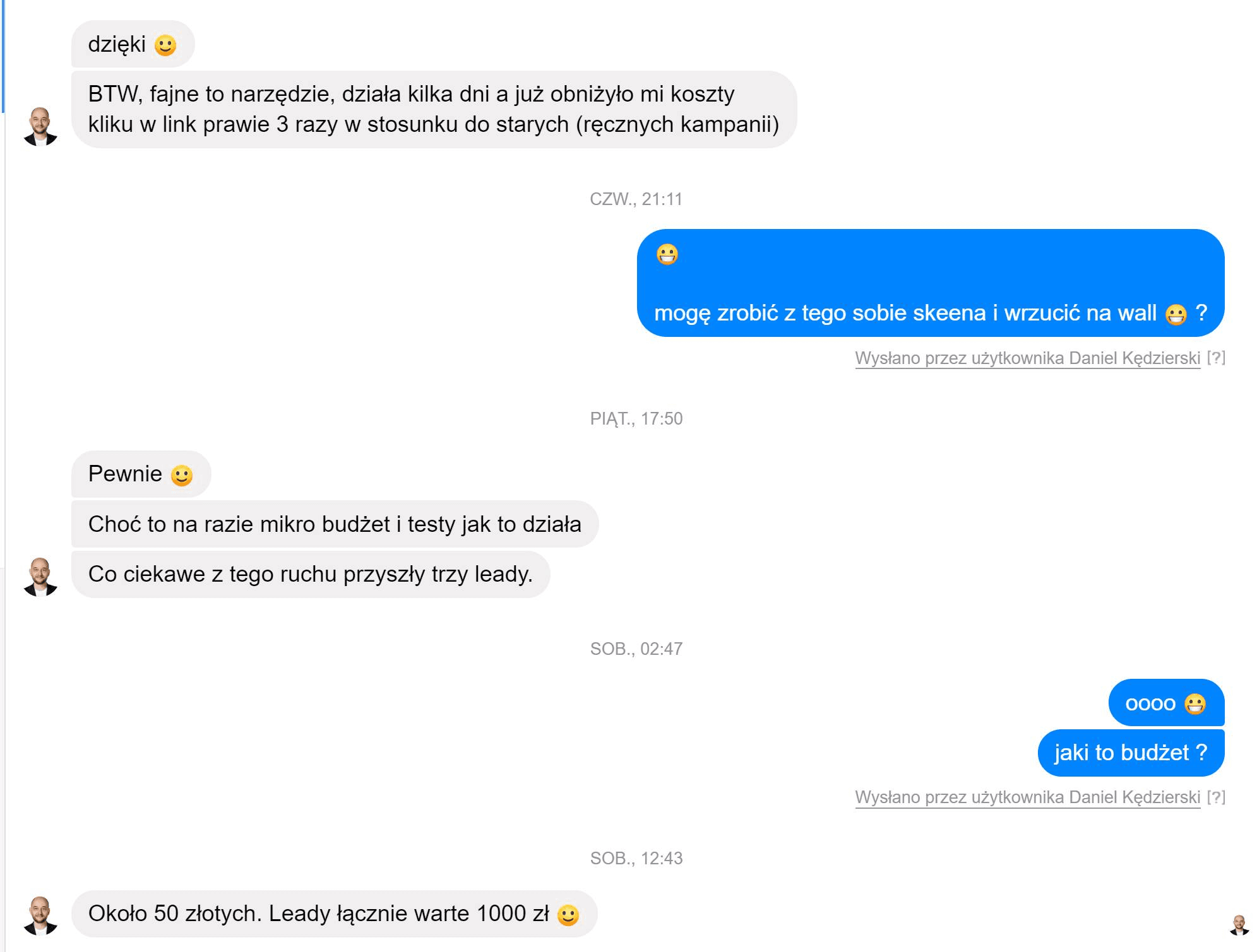 Klient ujął to krótko: "Działa kilka dni, a już obniżyło mi koszty kliknięcia prawie 3 razy w stosunku do starych (ręcznych) kampanii."
